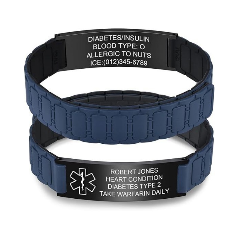 A flexible blue silicone medical bracelet, equipped with magnetic snaps and customizable information plates, provides clear and durable medical identification for the wearer in emergency situations, ensuring timely and proper assistance.