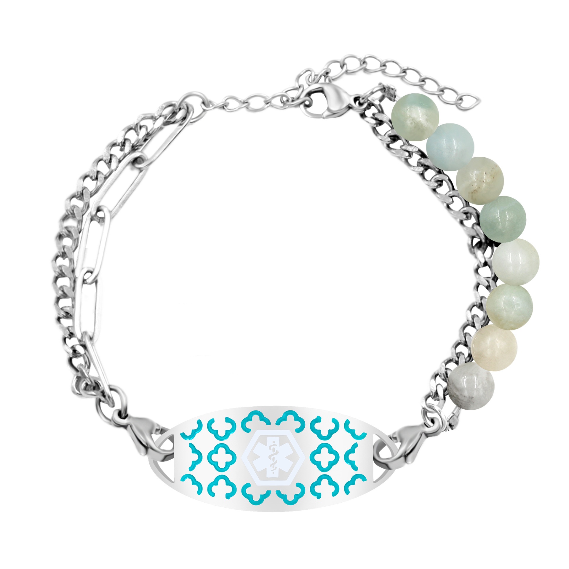 Overview: Elevate your essential medical ID into a beautiful, customizable piece of jewelry. This bracelet seamlessly combines the serene, healing energy of natural matte Amazonite beads with the critical functionality of a stainless steel medical ID tag. Designed for versatility and comfort, its interchangeable chain system allows you to match your style for any occasion without compromising on safety.