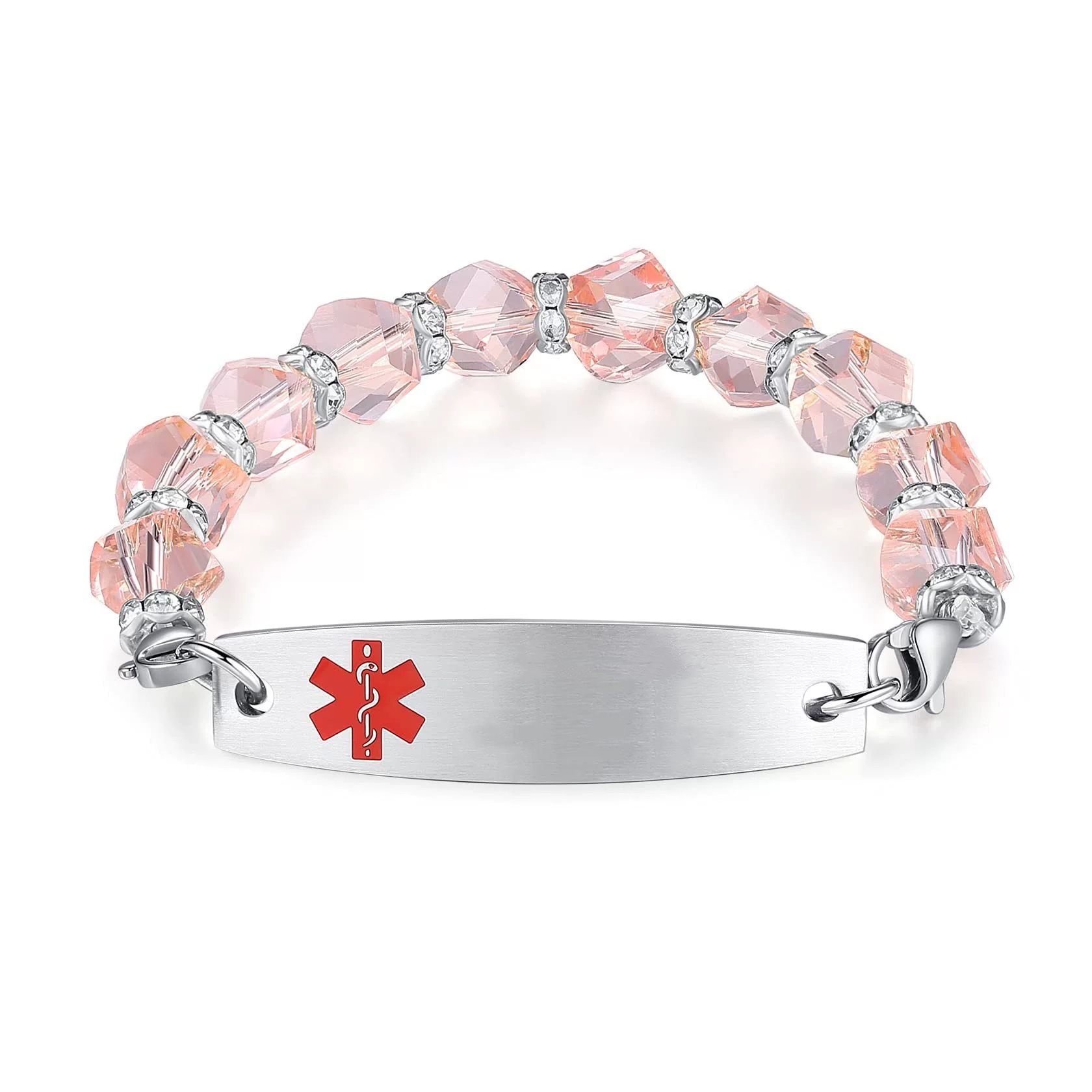 The **Mysterious Purple Crystals Medical ID Bracelet** is a sleek and sophisticated accessory designed for individuals who need to carry essential identification or medical information while maintaining a bold and stylish appearance. This bracelet combines functionality with a modern design, featuring **pink crystals**, and **stainless steel material**. Below is a detailed description based on the user’s requirements and general knowledge: