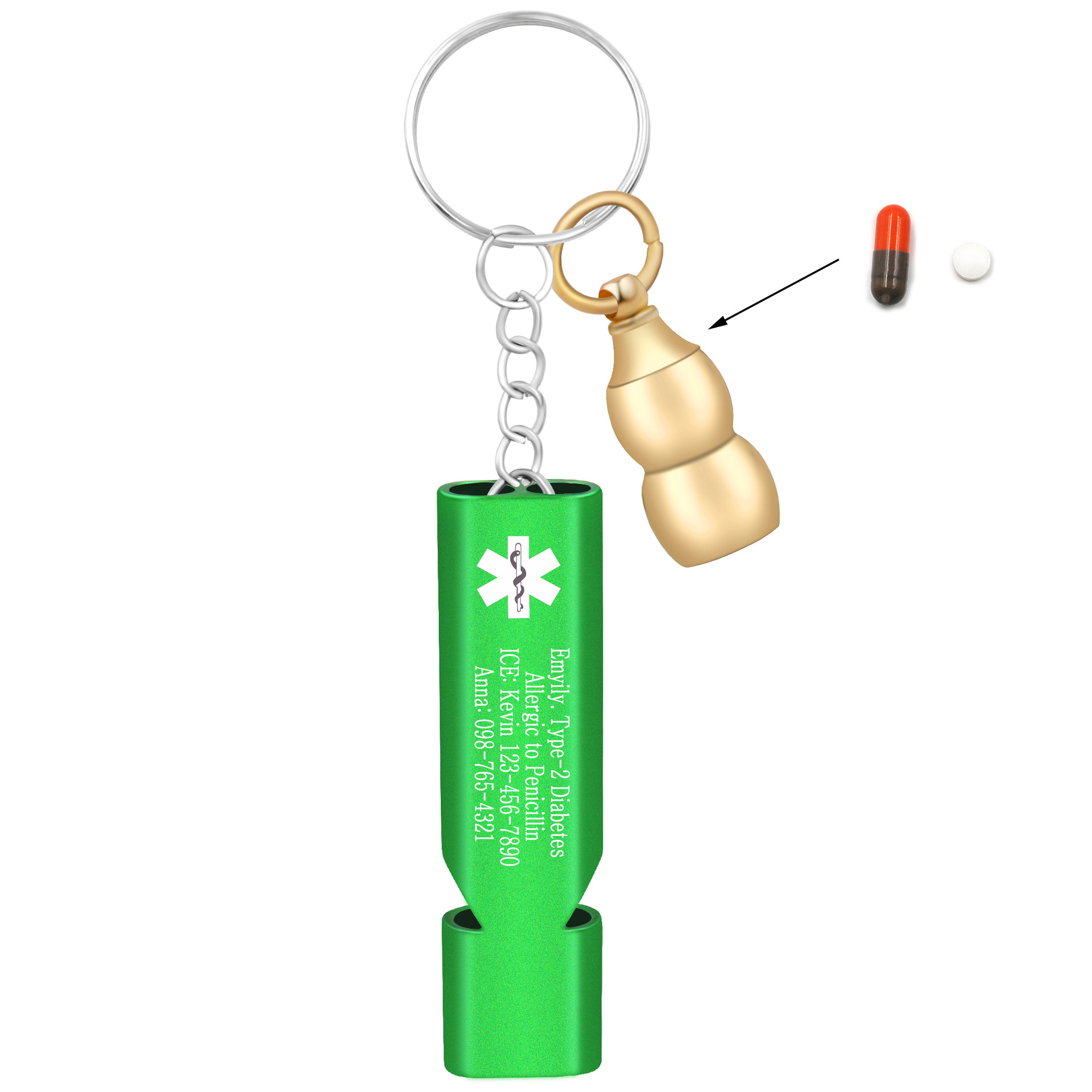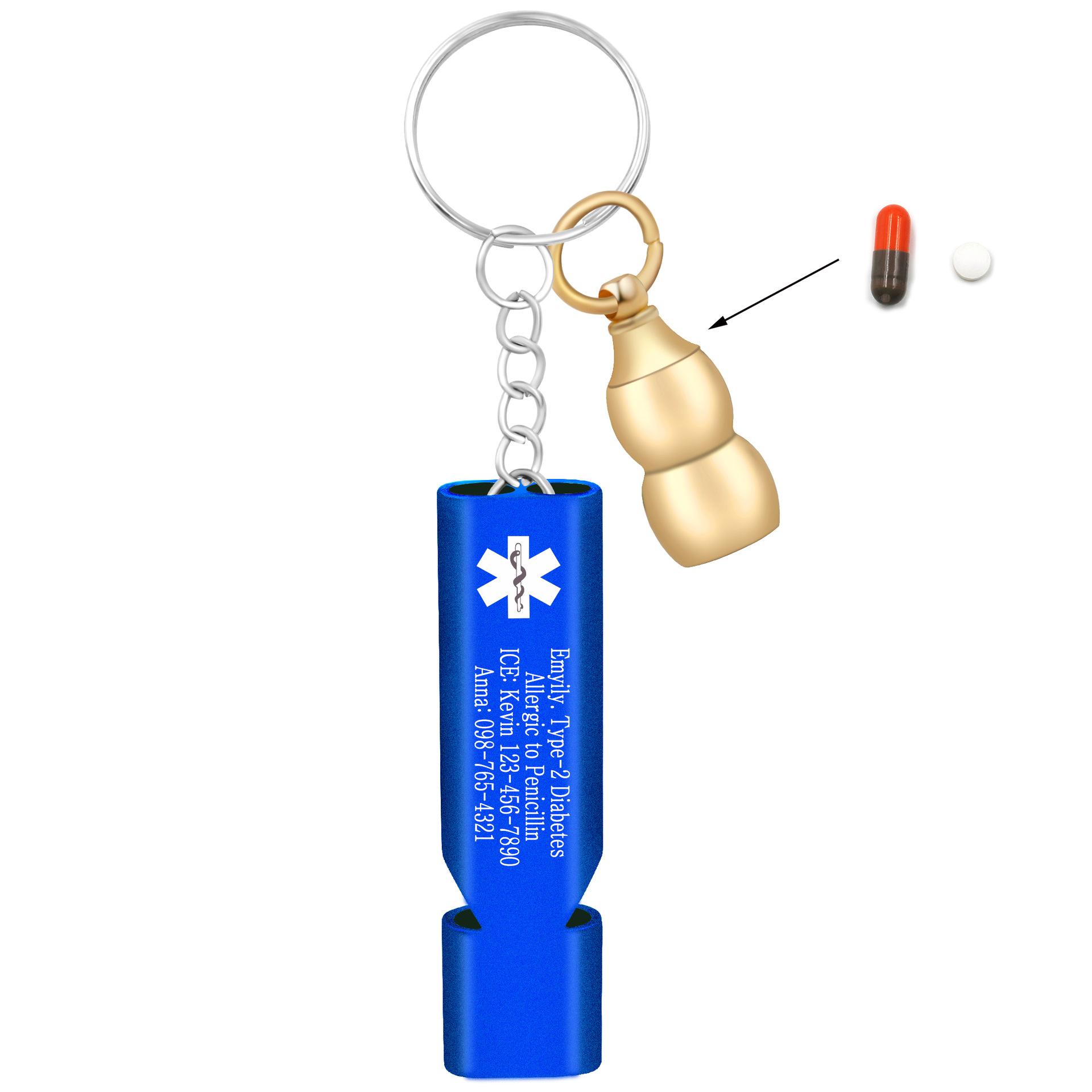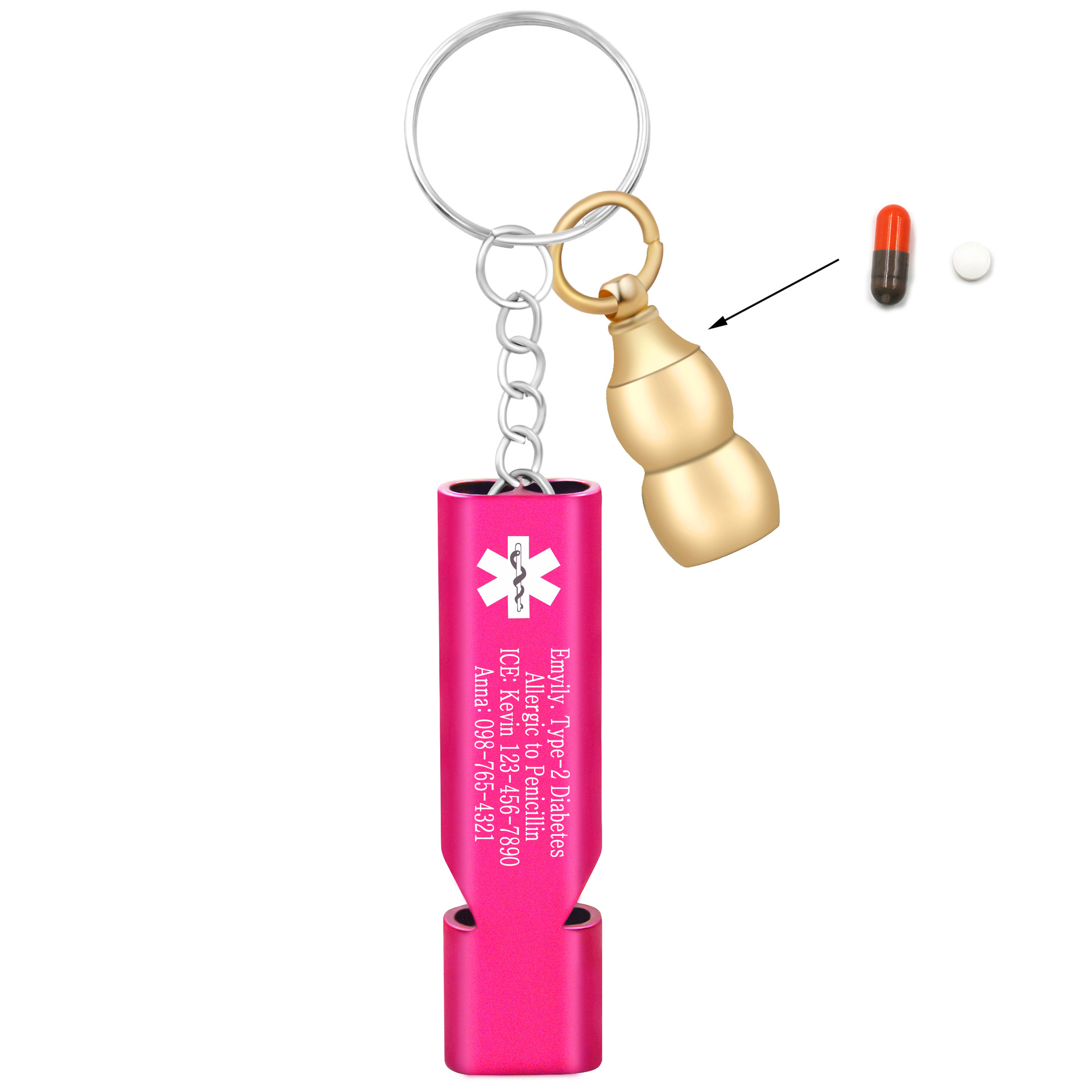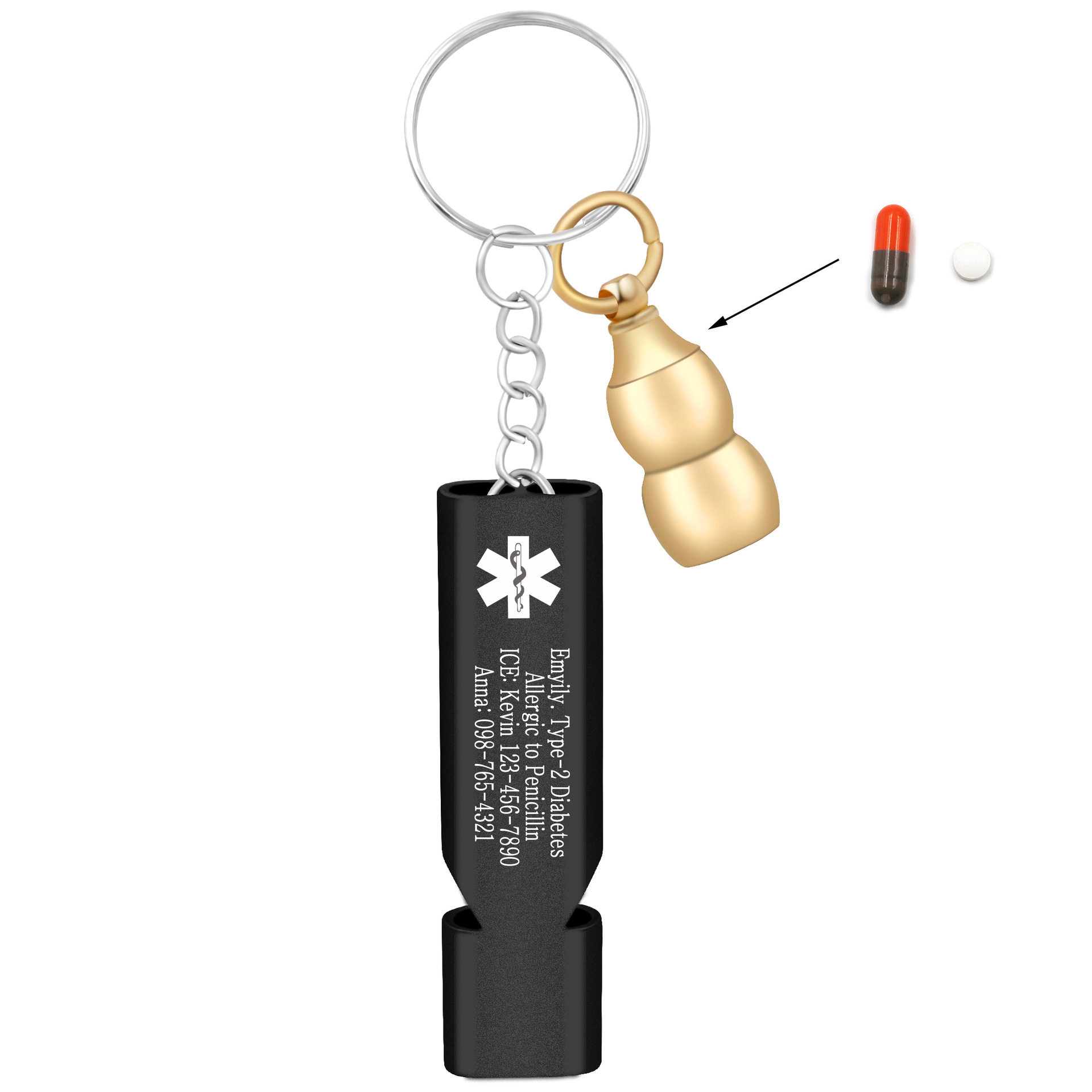 This product is a compact, lightweight, yet powerful emergency preparedness kit designed for outdoor enthusiasts, individuals with medical conditions, and anyone who values safety. It combines a high-decibel rescue whistle with a discreet medical information carrier and a pill container, all styled into a sleek, wearable pendant.