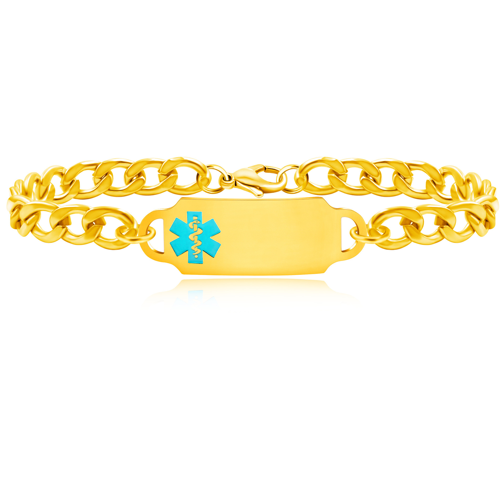 This bracelet features a popular jewelry chain style (curb) made from durable stainless steel, coated in a gold color using a high-tech PVD process, and includes a tag for essential medical or emergency information. It’s designed to be both a fashionable accessory and a vital safety device.