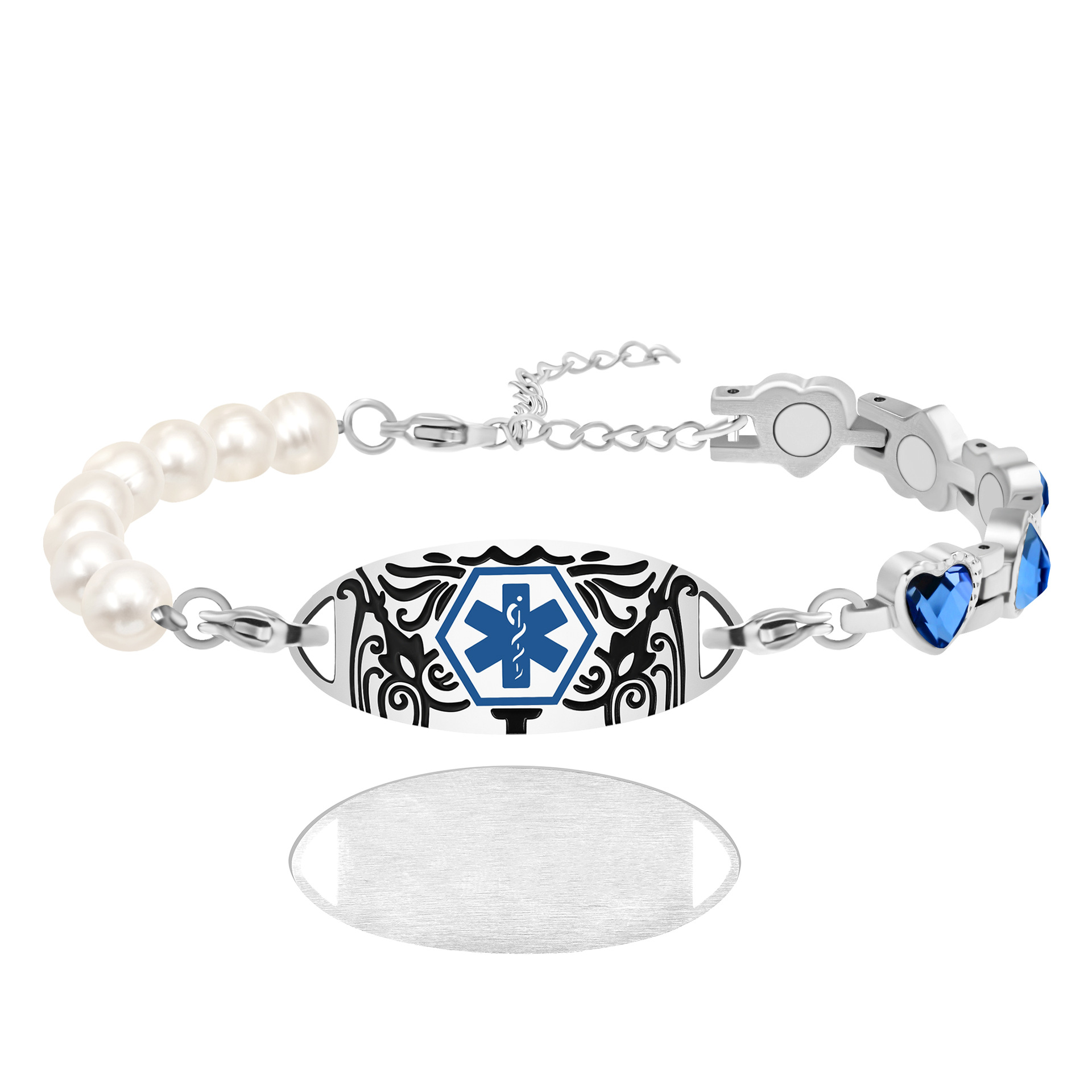 Women’s Sweet Blue Heart Crystals and Natural Pearls Medical ID Bracelets Interchangeable Features